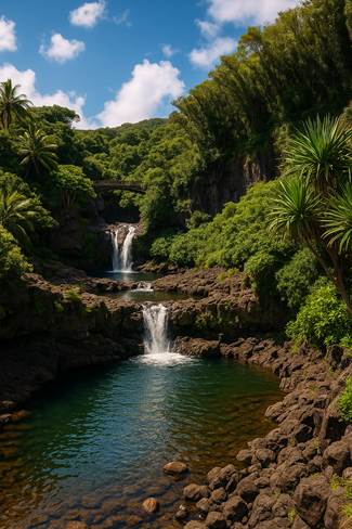 Maui's Road to Hana is a 64.4-mile scenic drive along the northeast coast that connects Kahului to the town of Hana, featuring numerous waterfalls, lush rainforests, and stunning ocean views. It is characterized by its winding, narrow roads, many sharp turns, and countless one-lane bridges, so caution and plenty of time are required. Stops along the way may include scenic overlooks, waterfalls, and black-sand beaches.